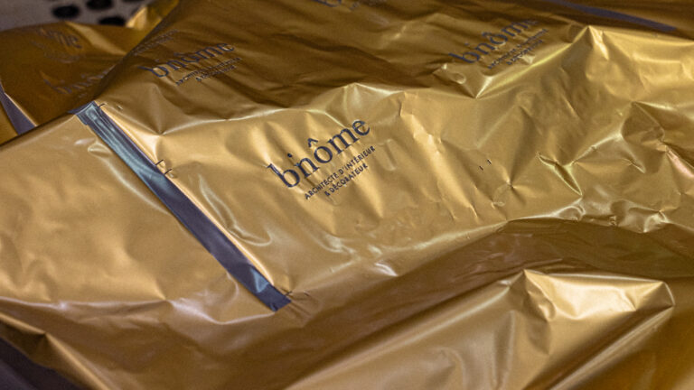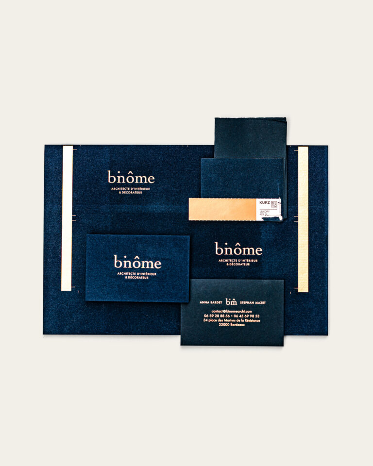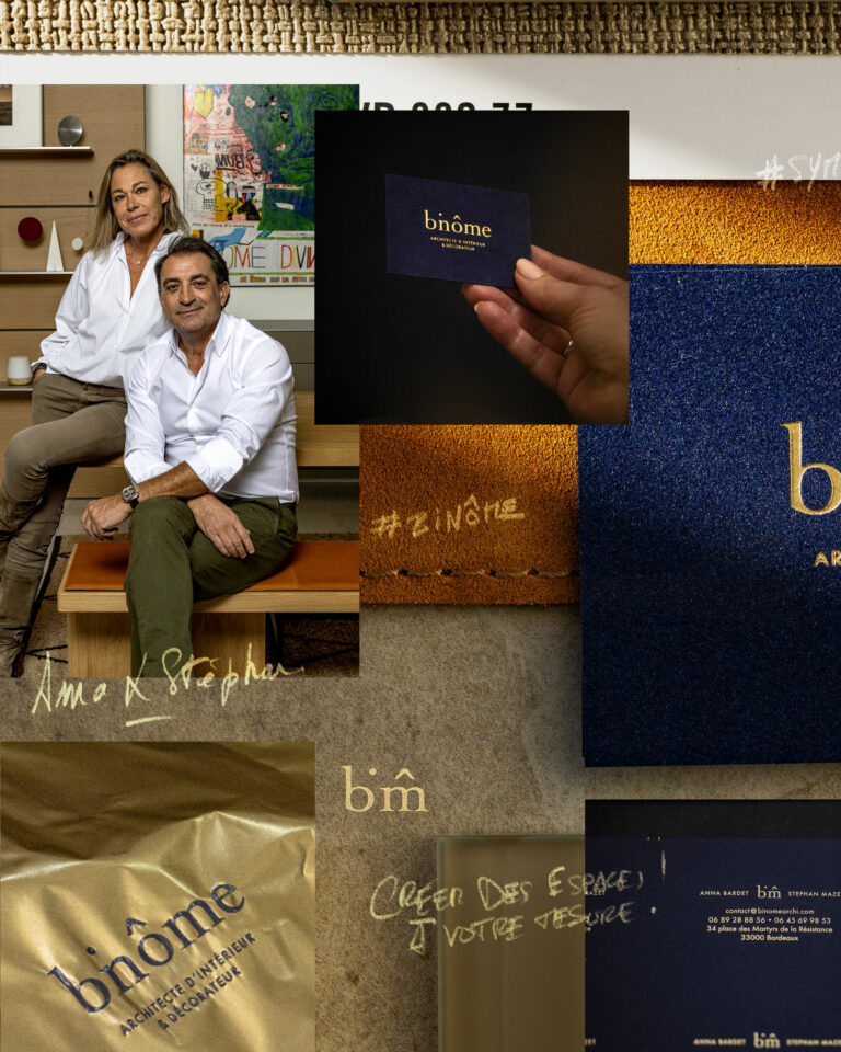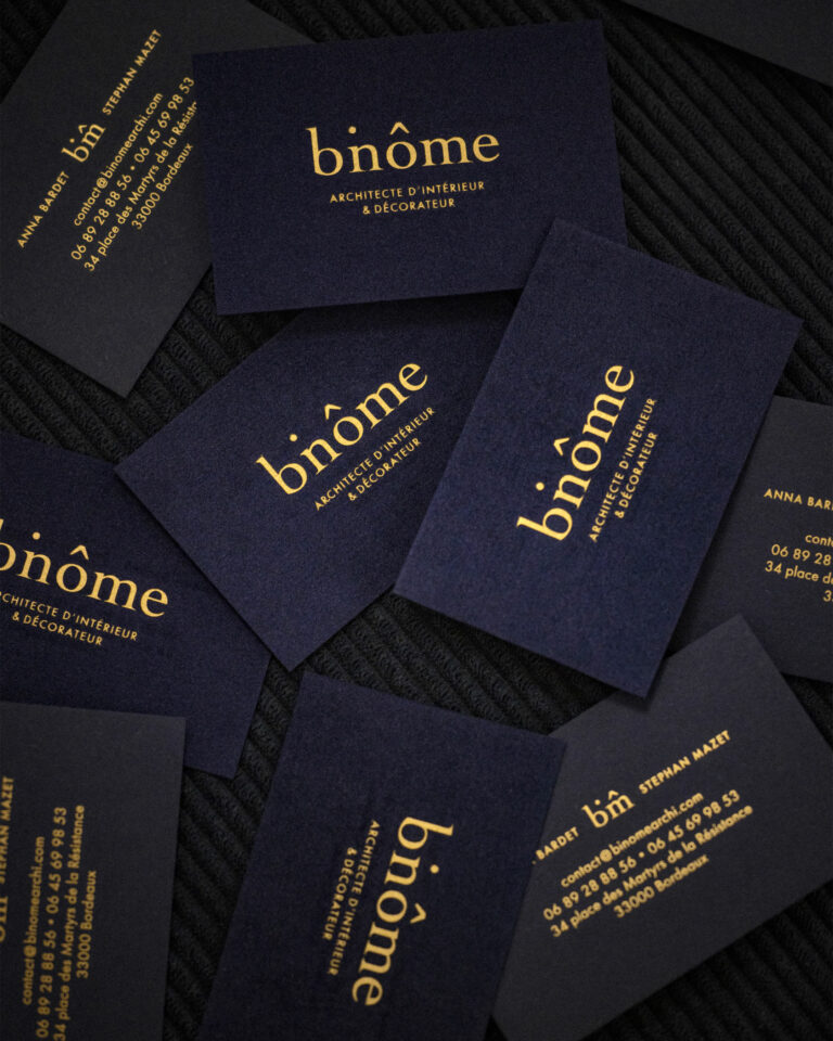 Deux talents, décoratrice et architecte, qui ne voulaient qu’un seul support : la carte de visite. Nous avons misé sur une astuce graphique et un velours emblématique, pour créer un marqueur fort dès le premier rendez-vous
